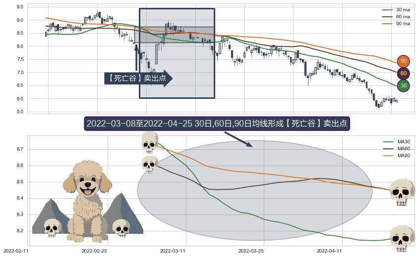 形态多维评估: ⚀ 2022-03-09-日至2022-04-25-日显现 30日-60日-90日均线 【死亡谷】卖出点 看空信号,后市看跌,卖出