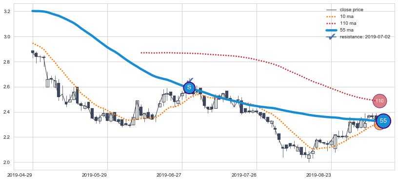 ⚅ 卖点向下突破均线后,价格走势有持续向下的迹象,但动能稍显不足,迟迟不能远离均线
