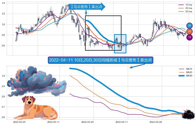 ⚀ 2022-03-16日-2022-05-11日显现 10日-20日-30日均线 【乌云密布】卖出点 看空信号,后市看跌,卖出