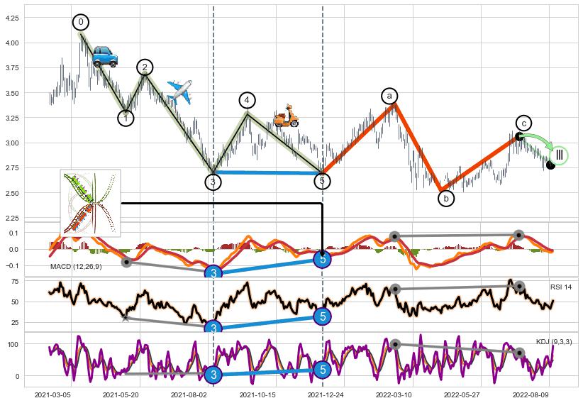 ➢ 1,3,5驱动浪MACD, RSI, KDJ走势都出现【常规背离】反转信号增强