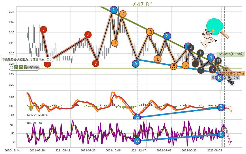 ♘ 在最后的下跌阶段2021-02-08至2022-08-12,存在 持续未破位的阻力位 ,阻力价格0.231818,可信任强度68.36%,其距离最后价格0.230000相差 +0.79%