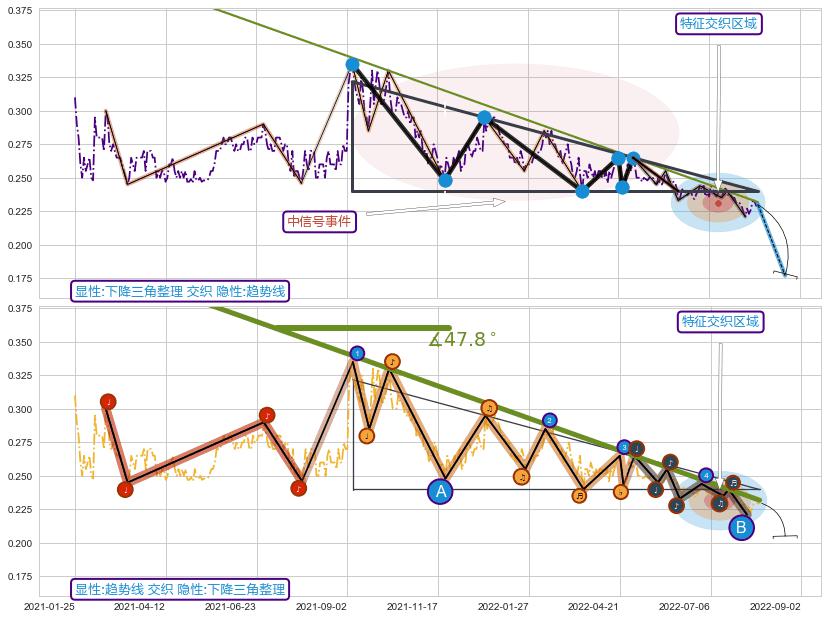 | 2 🅚:【死亡谷】卖出点 ➕ 📐:下降三角整理下行突破支撑位破位, 猜想持续下沉下跌,被突破的支撑位已变为阻力位 ☞ 看空信号 ⇥ 【均线】交织【图形】⇥ 综合量化分数: 33 | > |