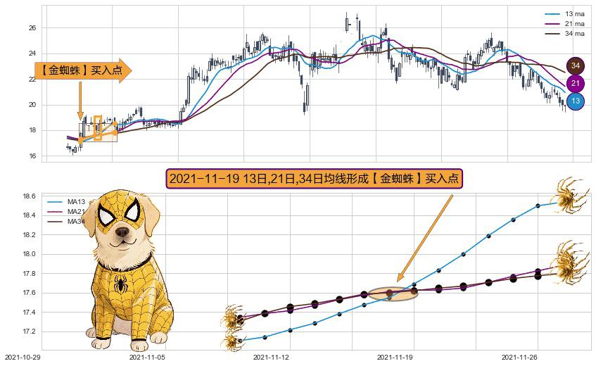 形态多维评估: ⚀ 2021-11-19日显现 13日-21日-34日均线 【金蜘蛛】买入点 看多信号,后市看涨,买入