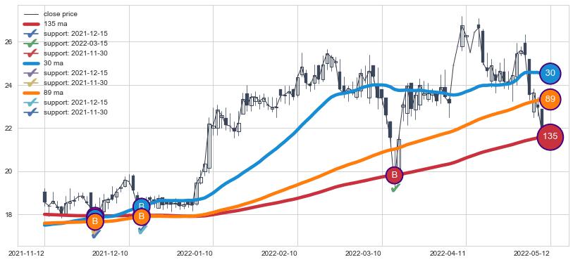 上涨趋势2021-11-12-2022-05-12,均线89, 30, 135确认关键支撑3处