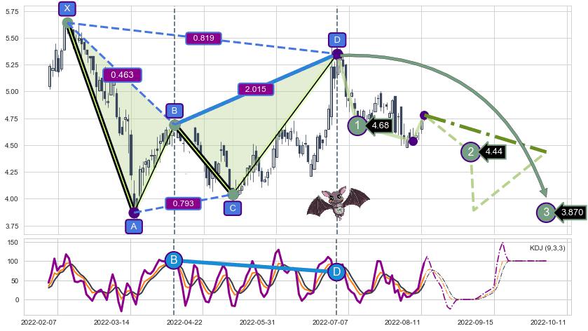 ➣ 已完成【蝙蝠】形态起点X: 2022-02-10, 终点D: 2022-06-30, 共94交易日
