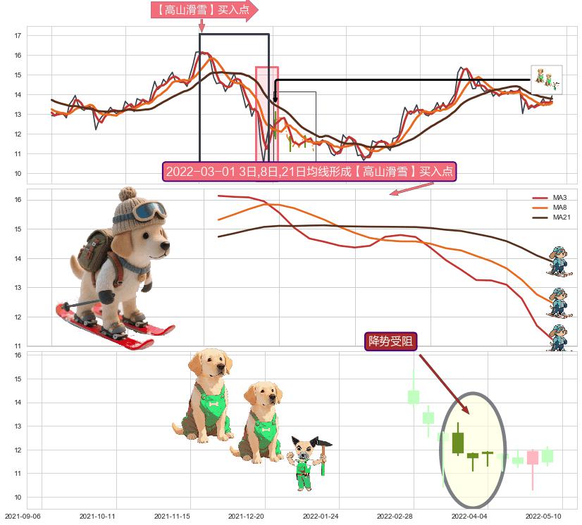 | 2 🅚:锤头线(锤子线) ➕ 🎢:【高山滑雪】买入点均线组合买入点信号形成后,猜想后续下行结束,持续反弹上涨(均值回复) ☞ 看多信号 ⇥ 【均线】交织【🅚线】⇥ 综合量化分数: 51 | > |