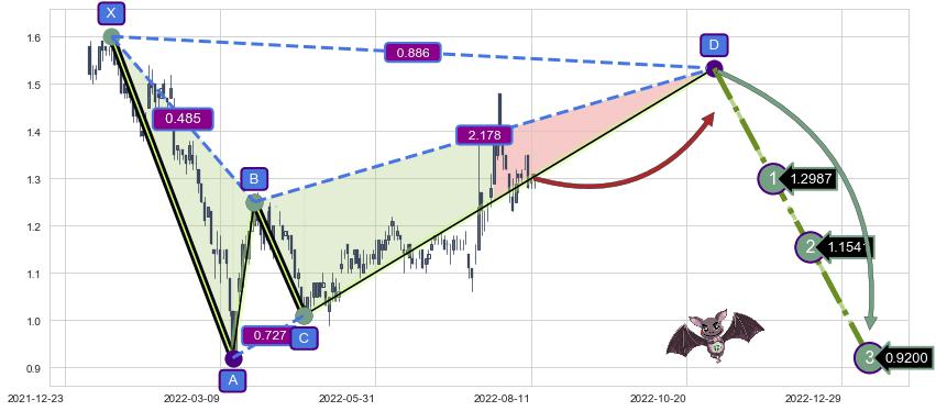➣ D点拟合预测价格1.5327,距离最后交易收盘价格1.3000相差 +17.90%
