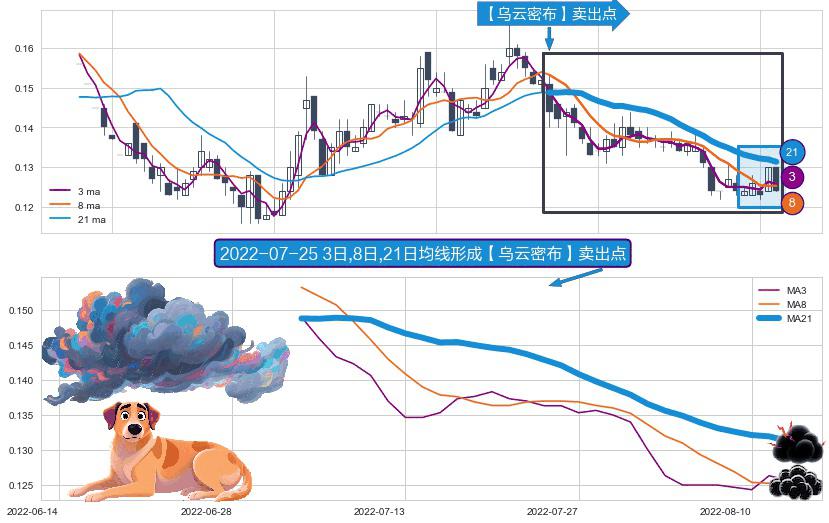 形态多维评估: ⚀ 2022-07-05日-2022-08-12日显现 3日-8日-21日均线 【乌云密布】卖出点 看空信号,后市看跌,卖出