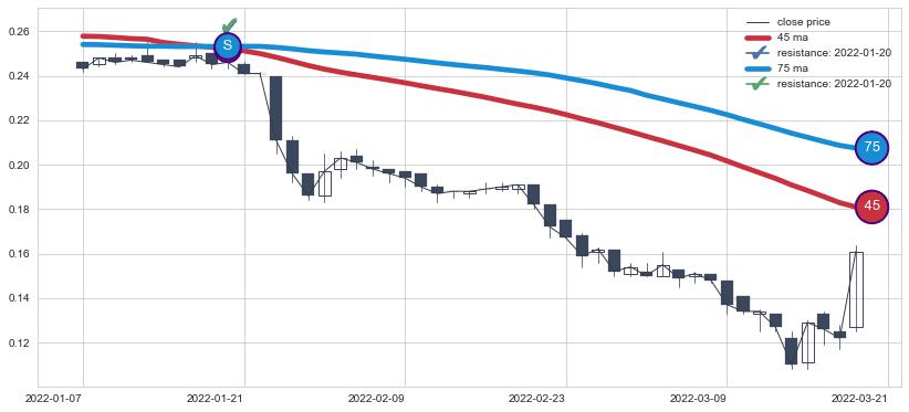 下跌趋势2022-01-07-2022-03-21,均线75, 45确认关键阻力1处