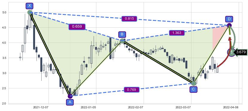 ➣ 未完成【蝴蝶】形态起点X: 2021-12-22, 已到达C点: 2022-03-18, 预测最终D点: 2022-04-08, 共66交易日