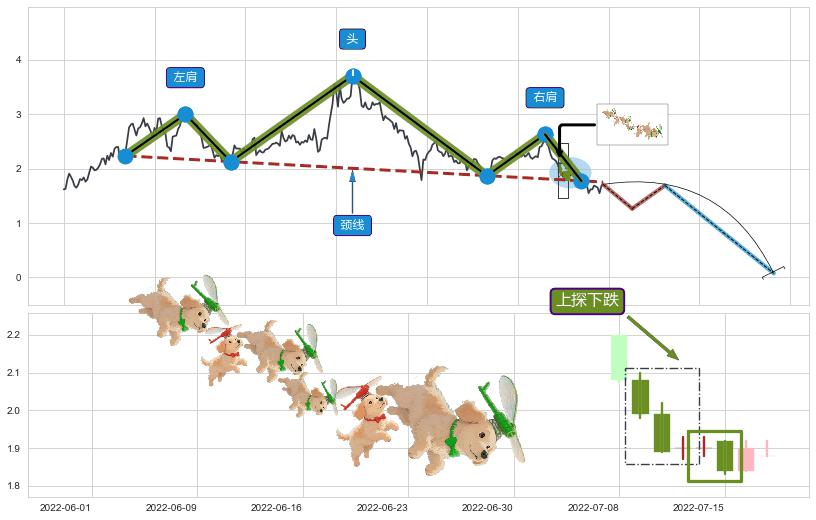 | 3 🅚:【毒蜘蛛】卖出点 ➕ 📐:头肩顶下行突破支撑位破位, 猜想持续下沉下跌,被突破的支撑位已变为阻力位 ☞ 看空信号 ⇥ 【均线】交织【图形】⇥ 综合量化分数: 4 | > |