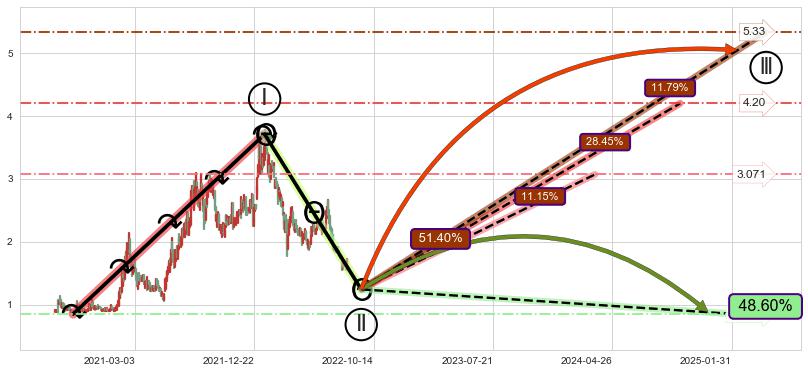 ➢ 大趋势走坏(跌破5浪起点位置)概率48.60%