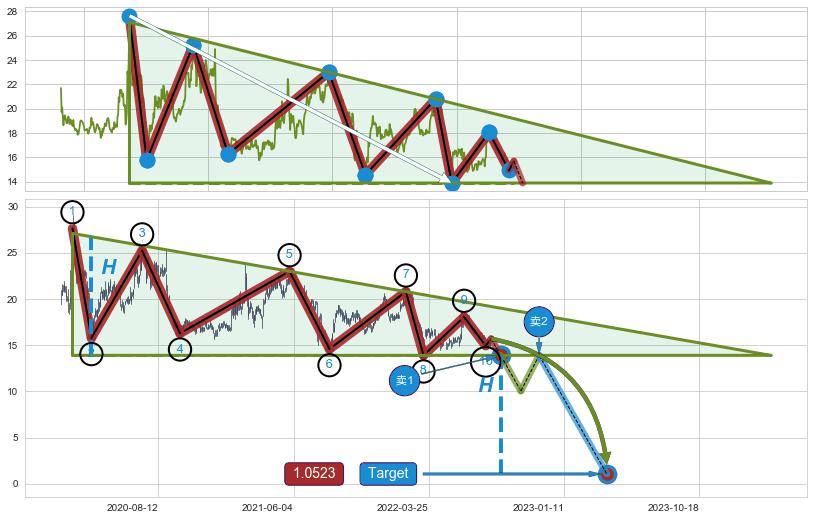 ➢ 最小中继整理跌幅→𝐇: 8.42 (𝐇楔型旗杆的长度:楔型起点→顶点)