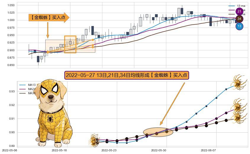 ⚀ 2022-05-27日显现 13日-21日-34日均线 【金蜘蛛】买入点 看多信号,后市看涨,买入