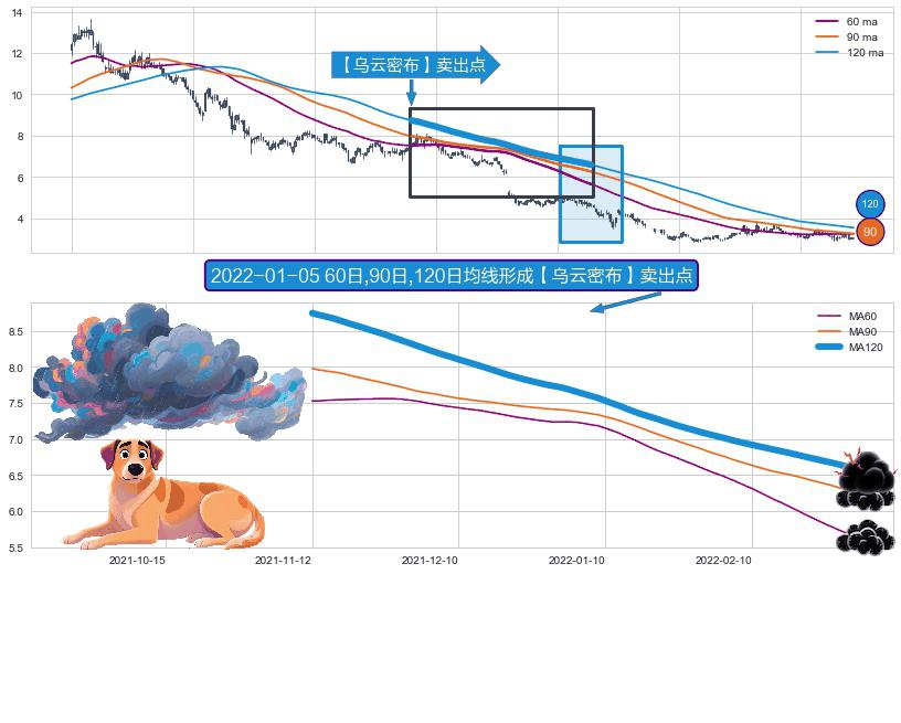 形态多维评估: ⚀ 2021-11-12日-2022-03-02日显现 60日-90日-120日均线 【乌云密布】卖出点 看空信号,后市看跌,卖出