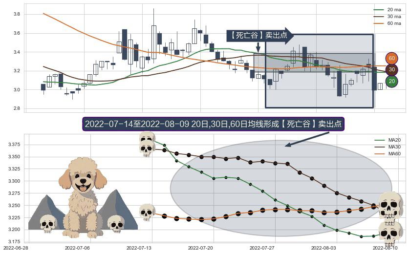 形态多维评估: ⚀ 2022-07-15-日至2022-08-09-日显现 20日-30日-60日均线 【死亡谷】卖出点 看空信号,后市看跌,卖出