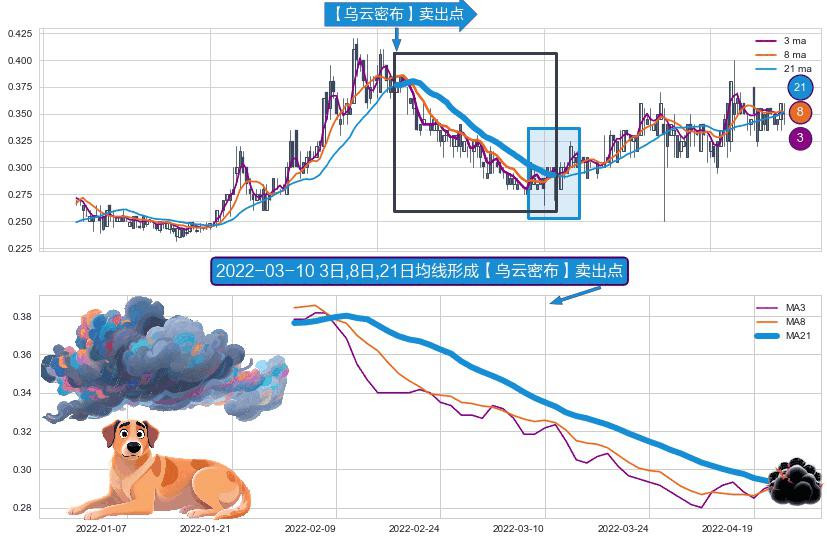 ⚀ 2022-01-31日-2022-04-22日显现 3日-8日-21日均线 【乌云密布】卖出点 看空信号,后市看跌,卖出