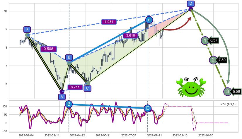 ➢ 【仅预测突破】最后价格:9.00与预测突破价格:8.59→【空间较大】后续最小【反转】第一目标价格→(2022-09-13: 7.57 )
