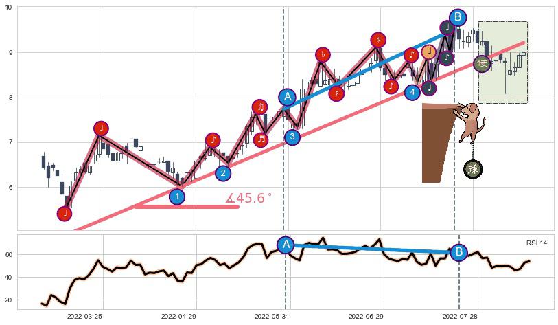 ✂️ 2022-03-15-2022-07-27上升趋势存在反转[风险],虽然原上升趋势的支撑位(9.21)已破位,但其支撑效果尚存,原上升趋势角度: 45.6˚