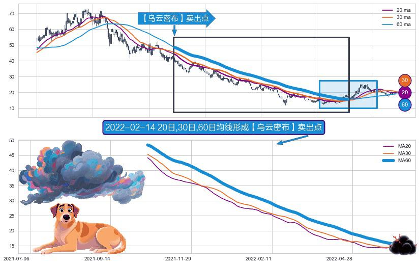 ⚀ 2021-10-21日-2022-06-10日显现 20日-30日-60日均线 【乌云密布】卖出点 看空信号,后市看跌,卖出