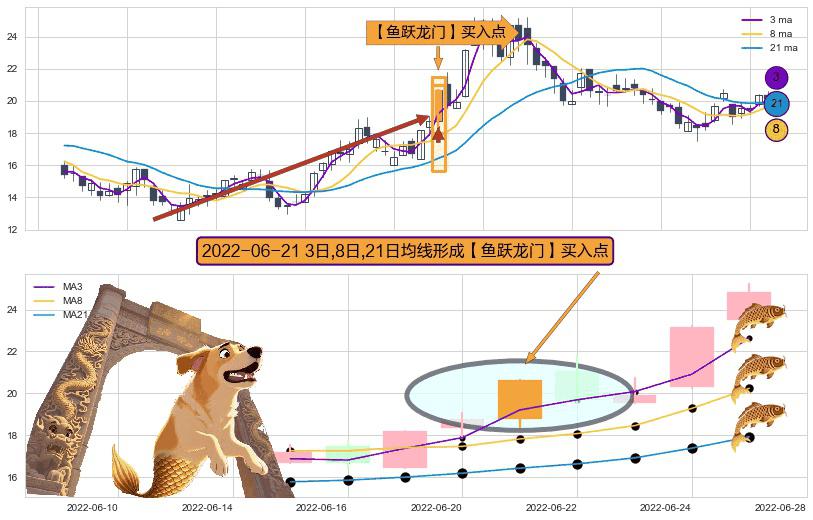 ⚀ 2022-06-21日显现 3日-8日-21日均线 【鱼跃龙门】买入点 看多信号,后市看涨,买入