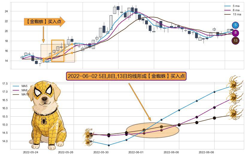 ⚀ 2022-06-02日显现 5日-8日-13日均线 【金蜘蛛】买入点 看多信号,后市看涨,买入