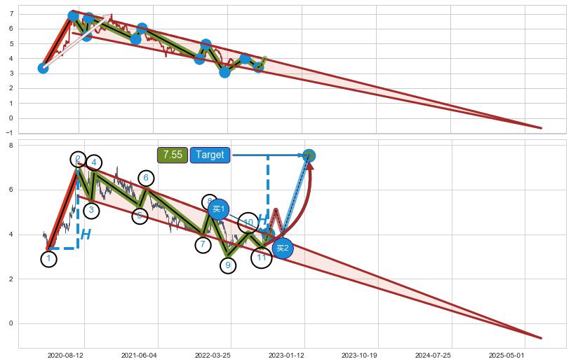 ➣ 【未确认突破,预测即将形成突破】降🚩楔型起点:2020-03-23, 预测突破点:2022-08-26,形态共598交易日