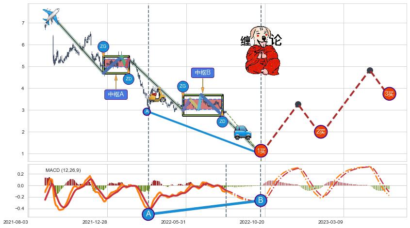 ➢ 【中枢B】:2022-05-25-2022-08-05,中枢由5笔构成,共51交易日, ZG=3.500, ZD=3.030