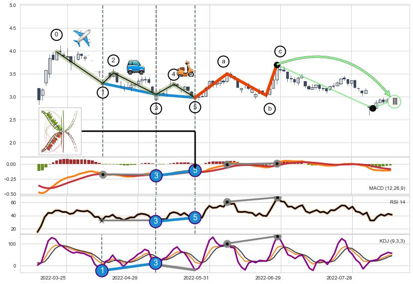 ➣ a,c调整浪MACD, RSI, KDJ走势都【未出现】背离,abc走势延续, 5浪反转概率增强
