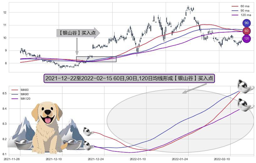 形态多维评估: ⚀ 2021-12-23-日至2022-02-15-日显现 60日-90日-120日均线 【银山谷】买入点 看多信号,后市看涨,买入