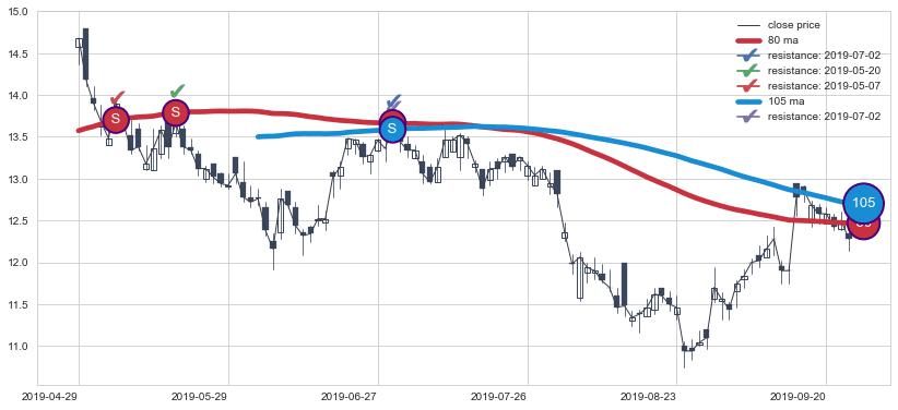 下跌趋势2019-04-29-2019-09-25,均线80, 105确认关键阻力3处