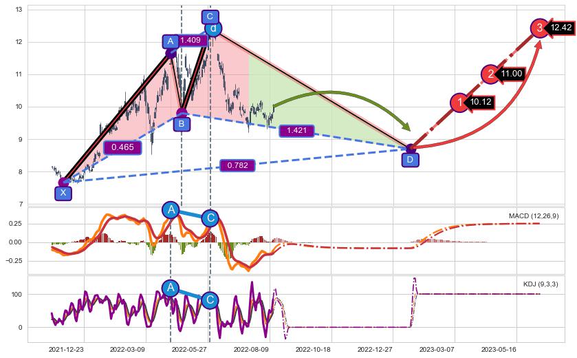 ➣ D点拟合预测价格8.70,距离最后交易收盘价格10.00相差 -13.02%