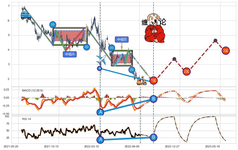 ➢ 【中枢B】:2022-05-12-2022-06-29,中枢由4笔构成,共34交易日, ZG=3.670, ZD=3.070