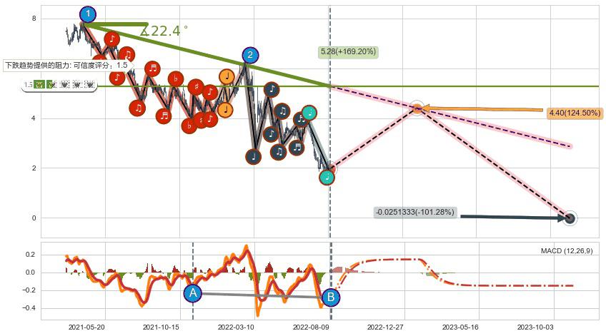 ♘ 在最后的下跌阶段2021-04-07至2022-08-12,存在 持续未破位的阻力位 ,阻力价格5.28,可信任强度59.84%,其距离最后价格1.9600相差 +169.20%