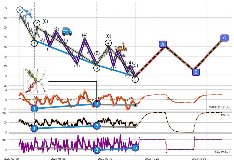 ➣ 1,3,5驱动浪MACD, RSI, KDJ走势都出现【常规背离】反转信号增强
