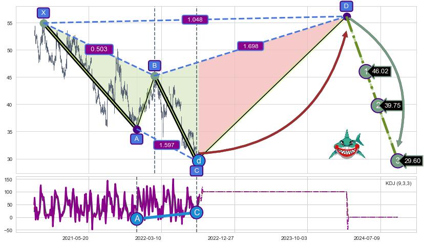 ➣ D点拟合预测价格56.17,距离最后交易收盘价格30.95相差 +81.48%