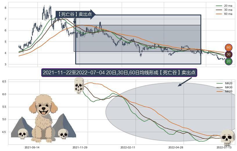 形态多维评估: ⚀ 2021-11-23-日至2022-07-04-日显现 20日-30日-60日均线 【死亡谷】卖出点 看空信号,后市看跌,卖出