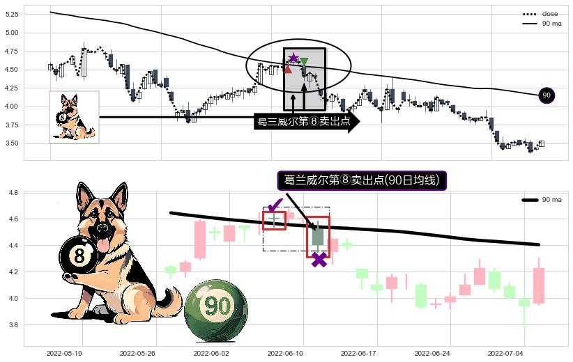 形态多维评估: ⚀ 2022-06-13-日显现 葛兰威尔均线 90日均线 第⑧卖出点 下降趋势的中继信号,后市看跌,卖出信号