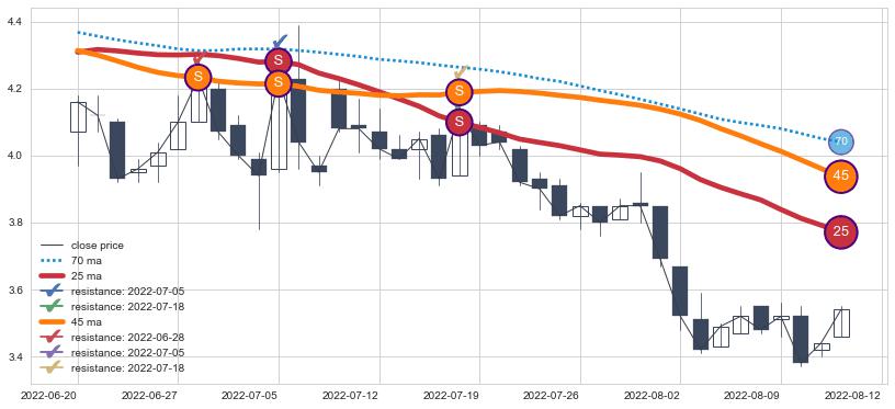 下跌趋势2022-06-20-2022-08-12,均线25, 45确认关键阻力3处