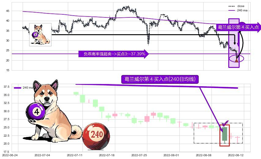 形态多维评估: ⚀ 2022-08-10-日显现 葛兰威尔均线 240日均线 第④买入点 下降趋势均值回复的短线反弹信号,后市看涨,买进信号