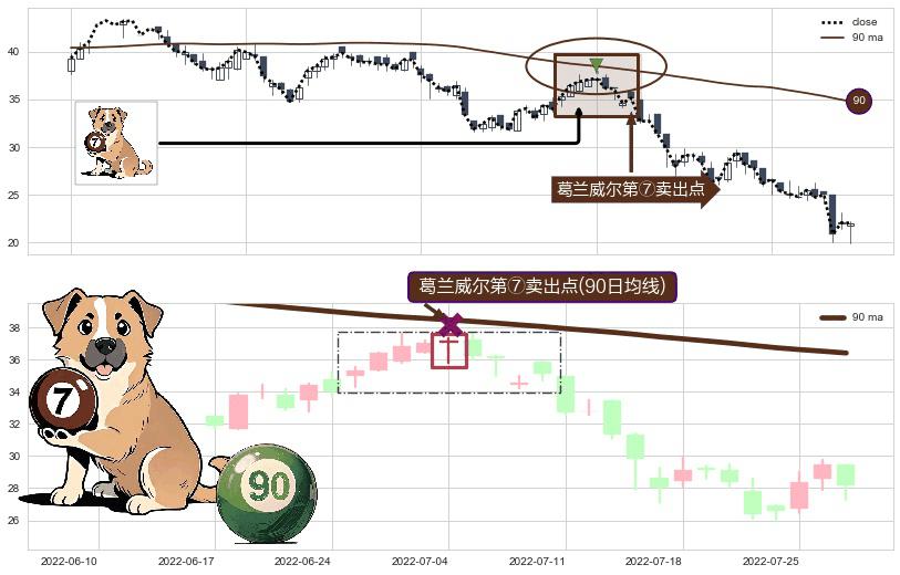 形态多维评估: ⚀ 2022-07-04-日显现 葛兰威尔均线 90日均线 第⑦卖出点 下降趋势的中继信号,后市看跌,卖出信号