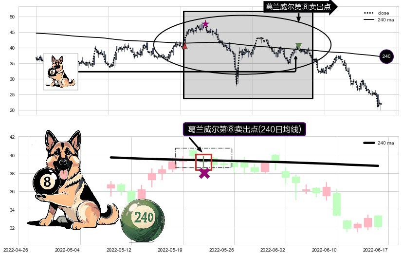 形态多维评估: ⚀ 2022-05-23-日显现 葛兰威尔均线 240日均线 第⑧卖出点 下降趋势的中继信号,后市看跌,卖出信号