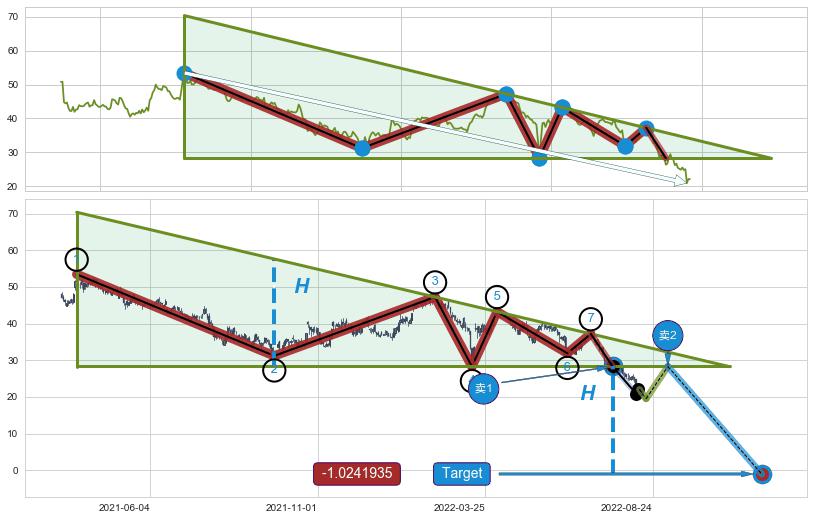 ➢ 最小反转跌幅→𝐇: 21.70 (逐步抬高阻力斜边最后的阻力点⑥与支撑边垂直距离)
