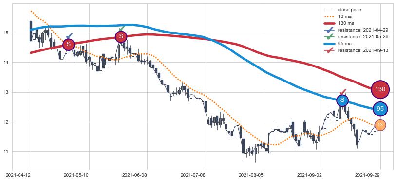 下跌趋势2021-04-12-2021-09-29,均线130, 95确认关键阻力3处