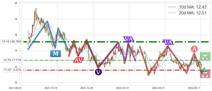 ♘ 阻力价格位12.79,可信任强度39.79%,距离最后交易2022-08-12形成的收盘价格11.94相差 +7.11%