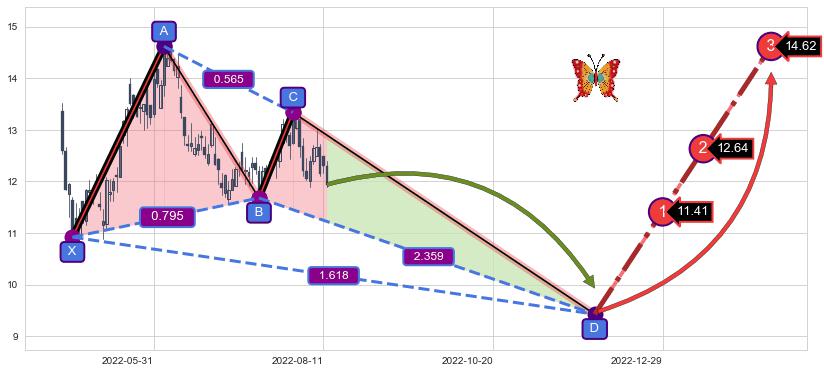 ➣ 未完成【蝴蝶】形态起点X: 2022-04-25, 已到达C点: 2022-07-29, 预测最终D点: 2022-12-01, 共155交易日