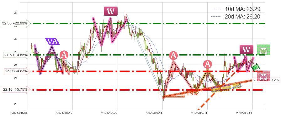 ➢ 【仅预测突破】最后价格:26.30与预测突破价格:26.80→【空间临近】后续最小【整理】第一目标价格→(2022-08-30: 29.19 )