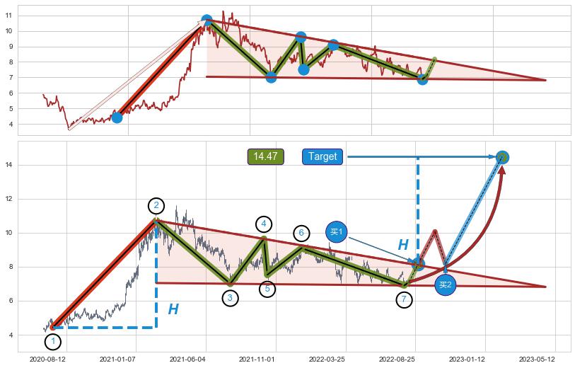 ➢ 最小中继整理涨幅→𝐇: 6.29 (𝐇楔型旗杆的长度:楔型起点→顶点)