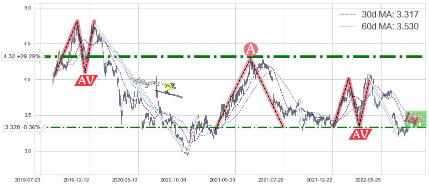 ♞ 30日均线:3.317,60日均线:3.530→ 快线<慢线