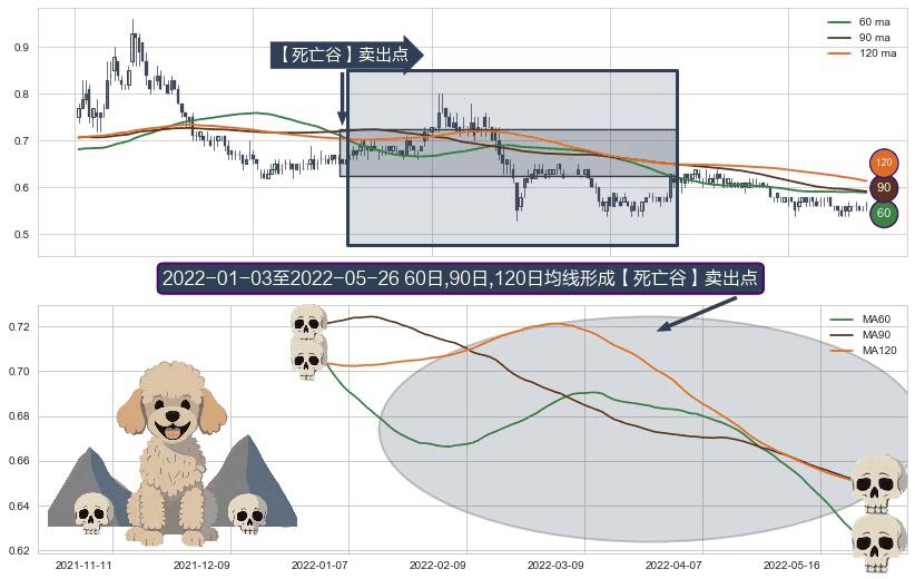 ⚂ 【死亡谷】卖出点 由MA60均线下穿MA90均线和MA120均线,MA90均线下穿MA120均线形成